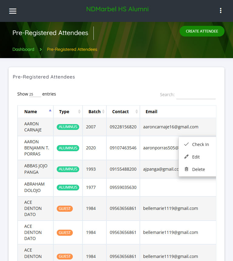 Annually, Notre Dame of Marbel University High School and Notre Dame of Marbel for Girls High School co-host a large-scale reunion. As a member of the organizing batch (Batch ’97), I recognized the logistical challenge of managing approximately 64 batches (from 1957–2021) and tracking each attendee and their guests using manual, paper-based methods.